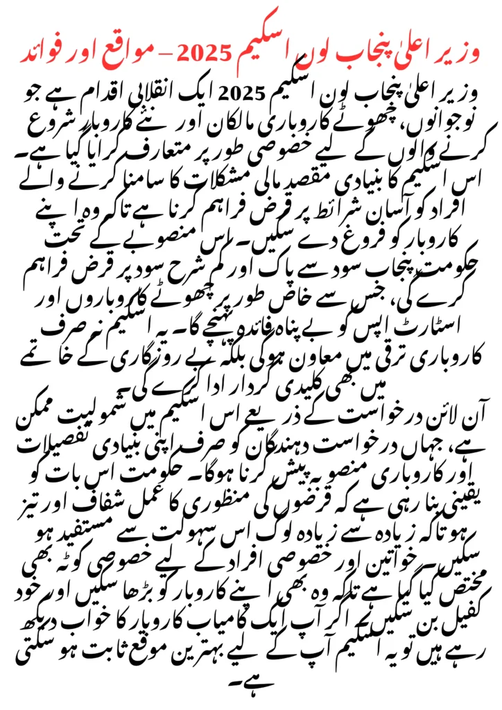 The CM Punjab Loan Scheme 2025 is a groundbreaking initiative introduced by the Punjab government to support individuals, small business owners, and aspiring entrepreneurs. Recognizing the financial struggles faced by many in starting or expanding their businesses, this scheme aims to provide interest-free and low-interest loans to empower economic growth. With a strong focus on youth empowerment, business expansion, and financial inclusion, this initiative is set to play a vital role in Punjab’s economic development.